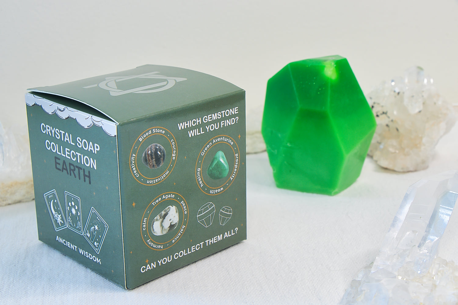 Elke zeep bevat een verborgen kristal, geselecteerd om de energie van de aarde te weerspiegelen, voor een magisch ritueel bij elke wasbeurt. De zeep is duurzaam geproduceerd met gerecycleerde materialen en natuurlijke ingrediënten, zodat je niet alleen goed zorgt voor je huid, maar ook voor de planeet.