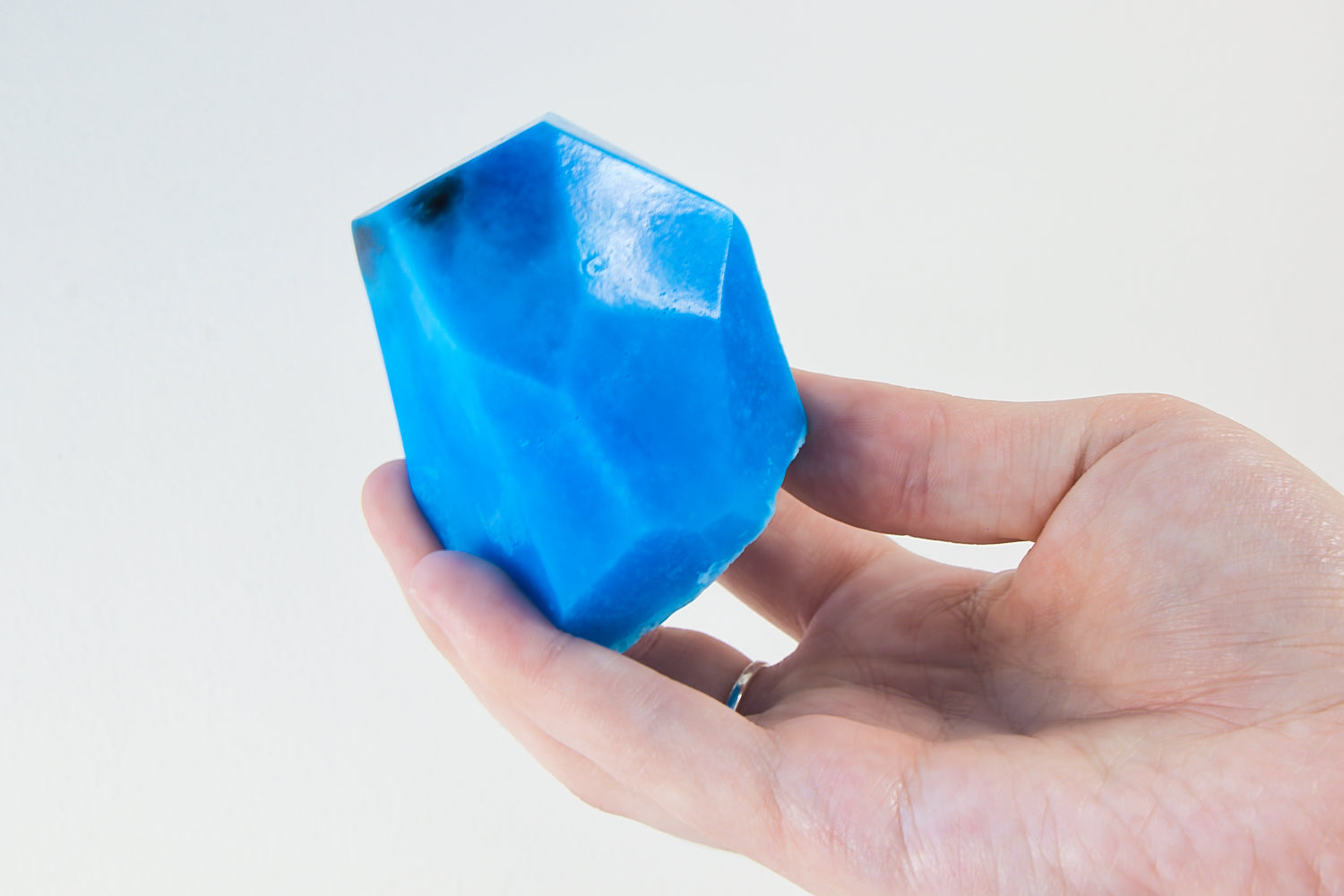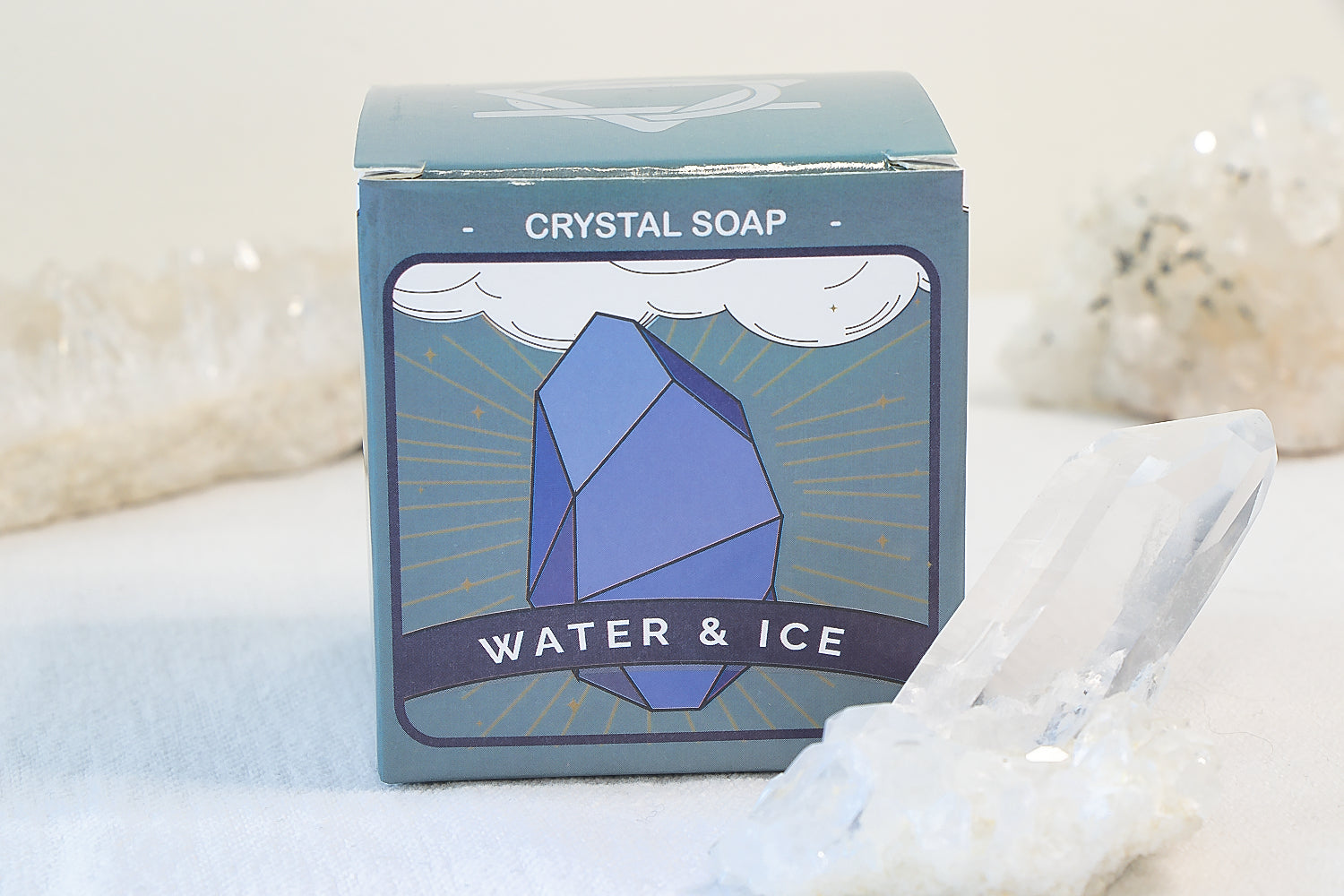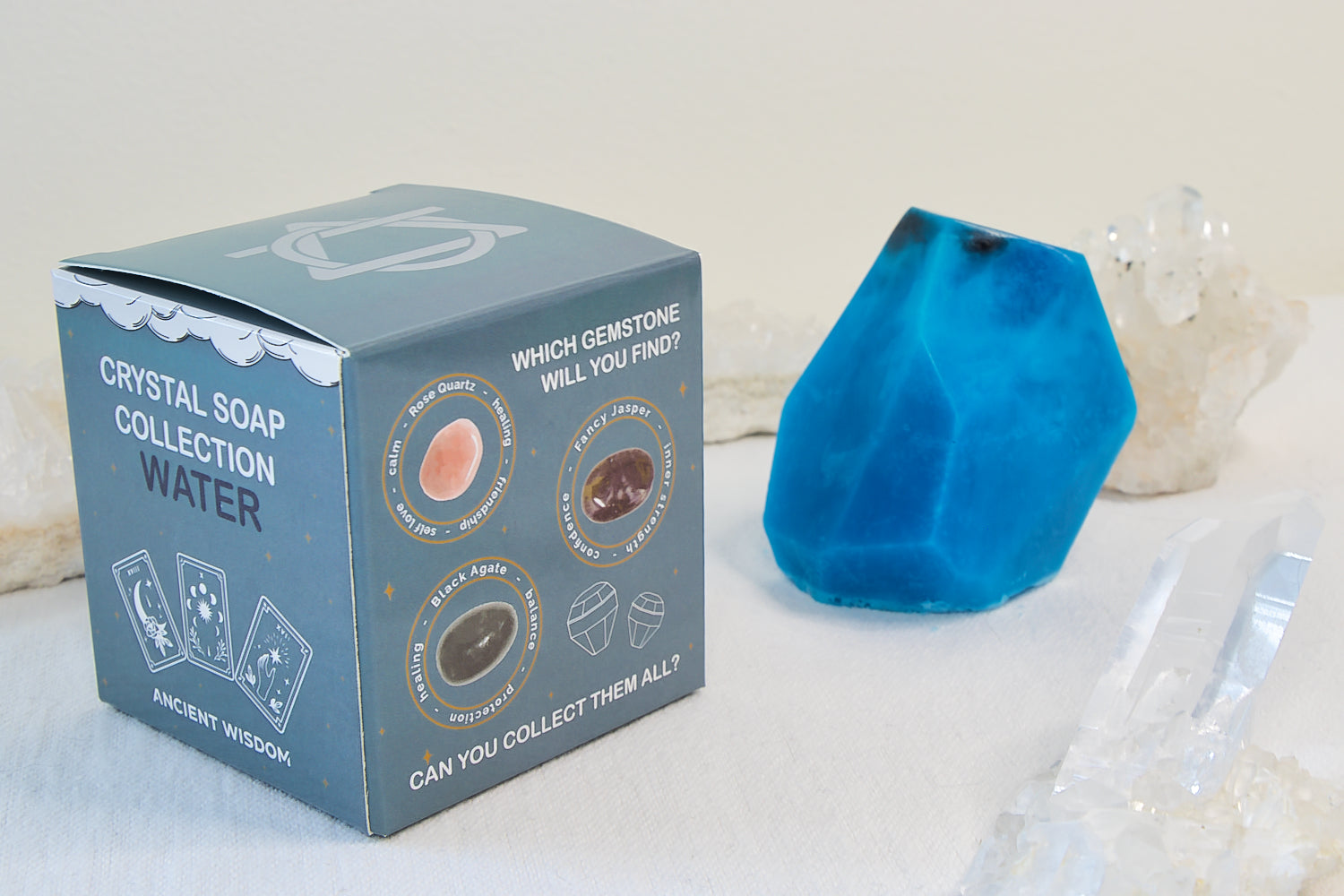 Elke zeep bevat een verborgen kristal, zorgvuldig gekozen om de energie van water te weerspiegelen, voor een magisch ritueel bij elke wasbeurt. De zeep is duurzaam geproduceerd met gerecycleerde materialen en natuurlijke ingrediënten, zodat je goed zorgt voor zowel je huid als de planeet.