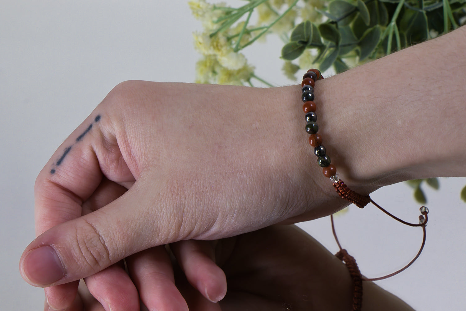 De set bevat een edelsteenarmband met rode jaspis, bloedsteen en hematiet, zorgvuldig gekozen om jouw kracht en vastberadenheid te versterken.