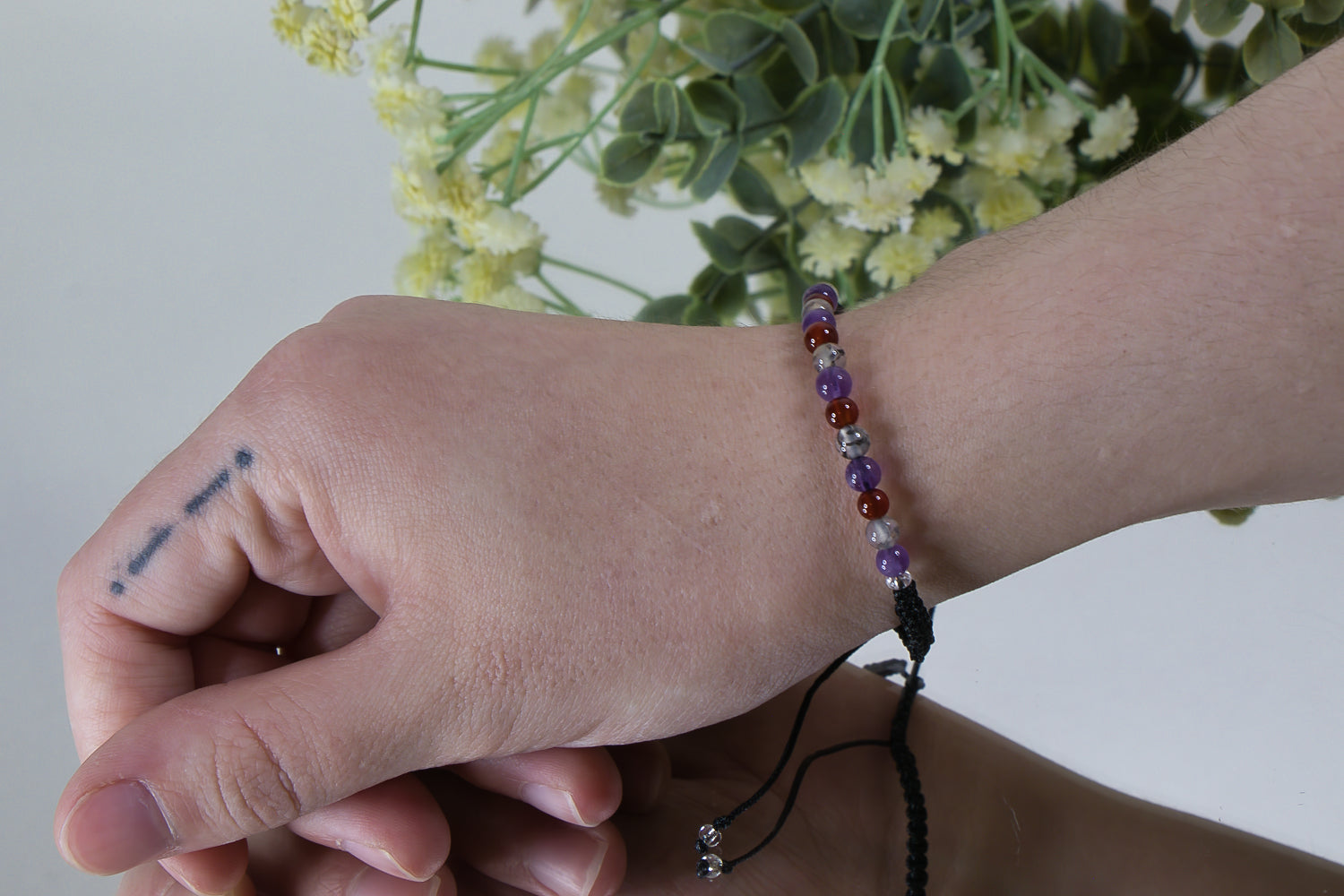 De set bevat een edelsteenarmband met amethist, carneool en mosagaat, zorgvuldig geselecteerd om de verzorgende en analytische kwaliteiten van Maagd te ondersteunen.