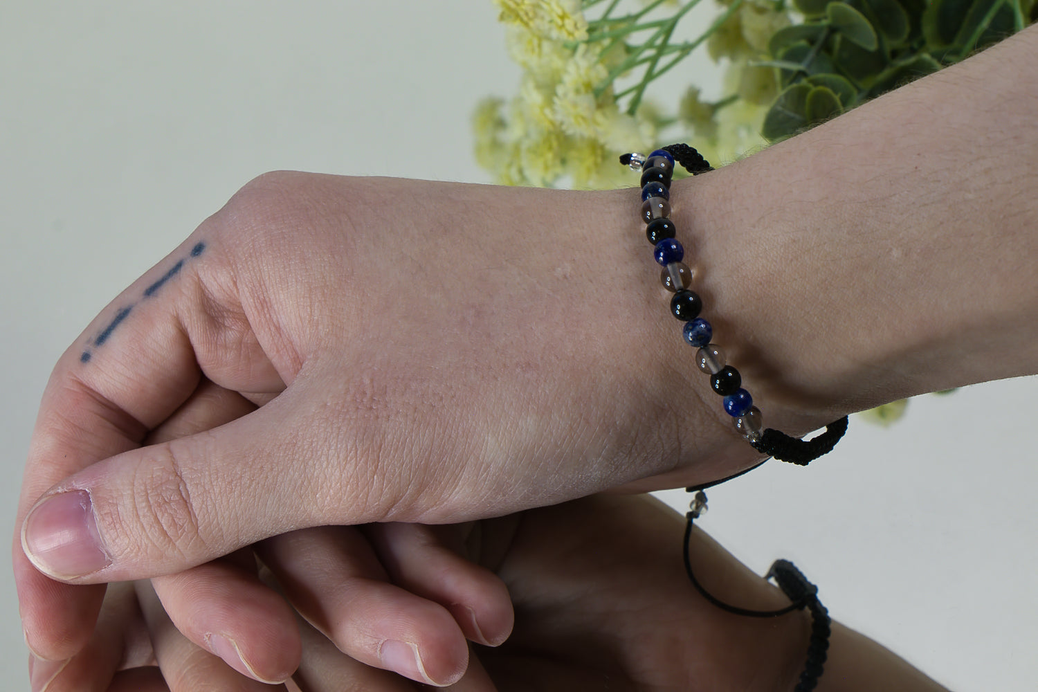 De set bevat een edelsteenarmband met rookkwarts, lapis lazuli en zwarte obsidiaan, zorgvuldig gekozen om de krachtige en magnetische aard van Schorpioen te versterken.