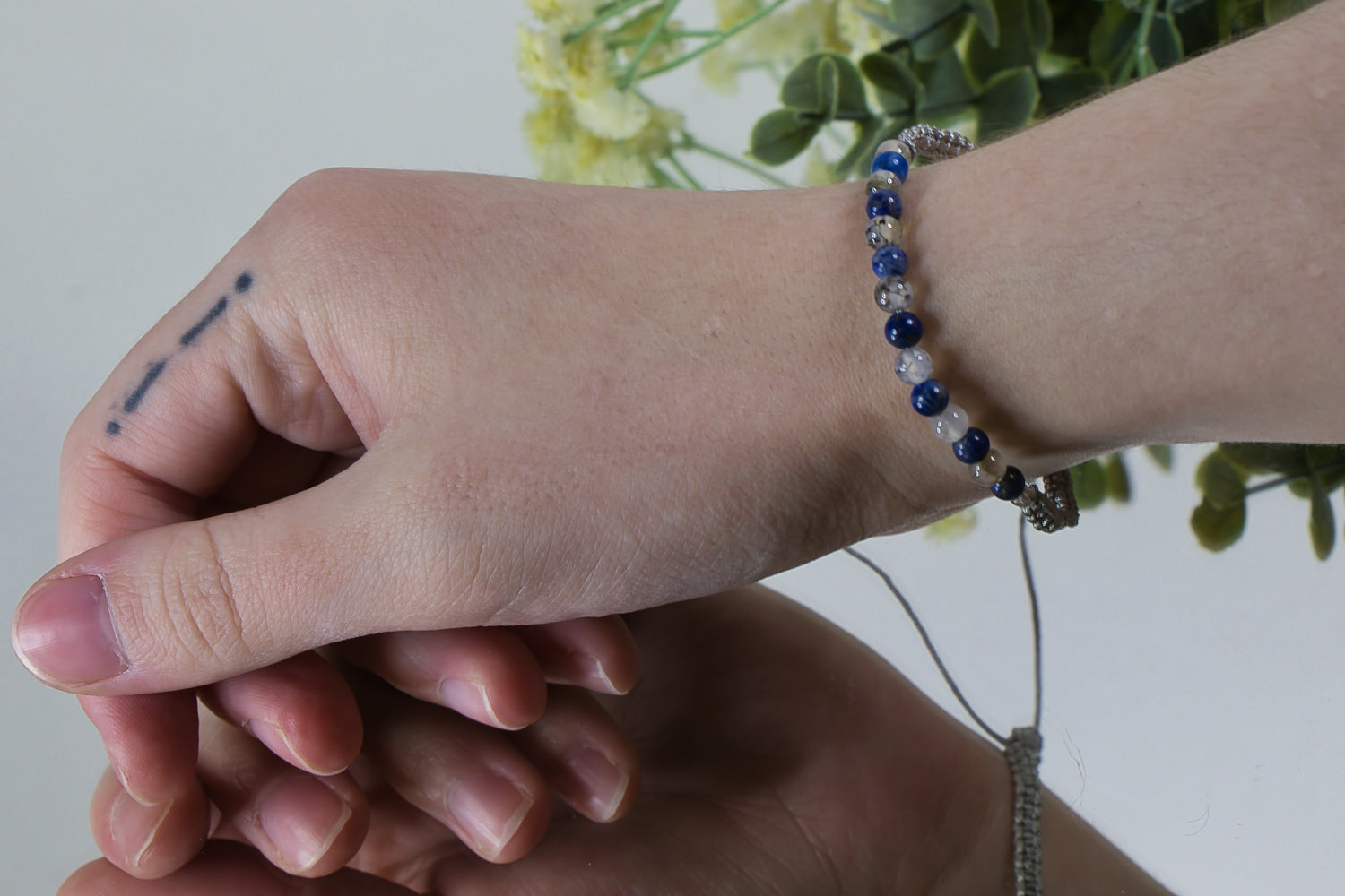 De set bevat een edelsteenarmband met maansteen, turkoois en aquamarijn, zorgvuldig gekozen om de zachte en spirituele aard van Vissen te ondersteunen.